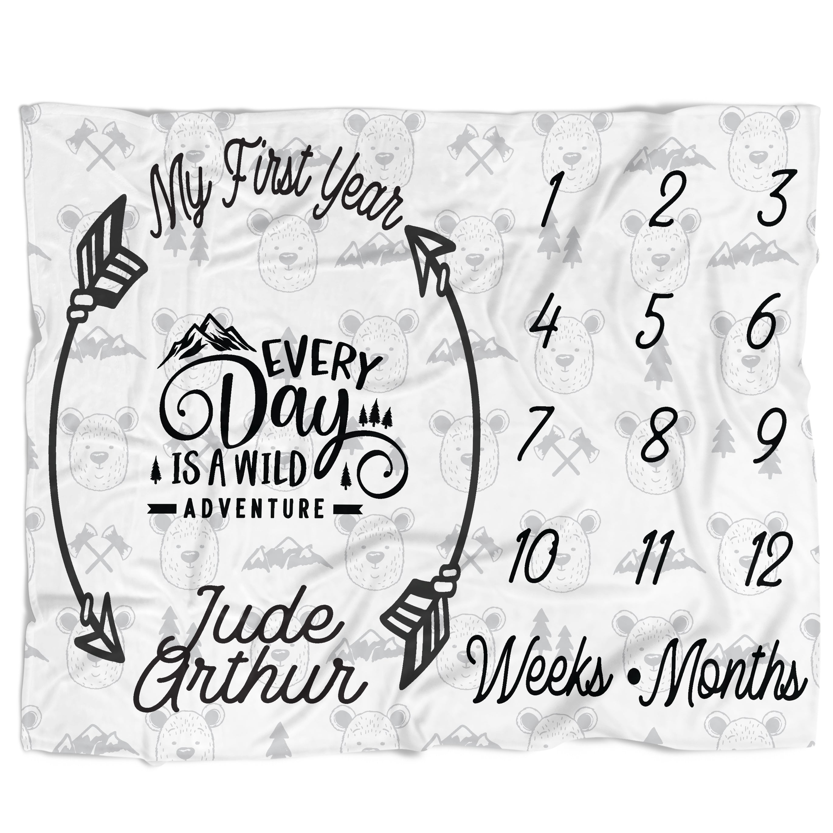 Featuring delightful adventure themes of bears and pine trees, this blanket is sure to create a sense of wonder and awe as you track your baby's monthly milestones. Whether you're using it for tummy time, snuggles, or photo shoots, this blanket is the ideal accessory for any baby's first year. You'll love how this blanket becomes a cherished keepsake for years to come, reminding you of all the special memories and milestones of your baby's first year.
